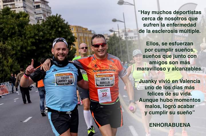 Del 34 al 40 se convierte en una lucha por cada zancada y es cuando Juanky lo empieza a pasar realmente mal. Los calambres son continuos. Si antes era el cuádriceps, ahora también se suman los isquios, tenemos que parar a estirar cada dos por tres, a esto se suma que el ritmo cardíaco se le sube por las nubes y también paramos para coger aire y recuperar el ritmo, también me comenta que ha dejado de oír por un oído, son las consecuencias de esta maldita enfermedad. Lo dicho hasta el 40 fue una angustia. Llegados a este punto kilométrico, encaramos una recta de 2 kms que nos lleva a la Ciudad de las artes y las ciencias y es aquí y por arte de magia, cuando Juanky deja de tener tantos problemas y comienza a encontrarse bien. La gente nos lleva en volandas y no paran de gritar nuestros nombres con ánimos. Km 41,5 vemos a Santi Molina con su cámara, sus fotografías plasman mucha alegría y emoción. ;DD